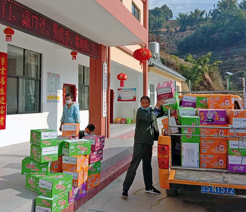 这是他们两天以来赶赴的第8个点,来来回回的山路他们跑了上百公里,就在昨天他们才把210箱面、3箱水、3箱饮料送到那杏、平掌、清河、南糯、平河、唐家、全河村7个公司挂钩的脱贫村村委会上。商店货架上的方便面都被他们搬空了5家!