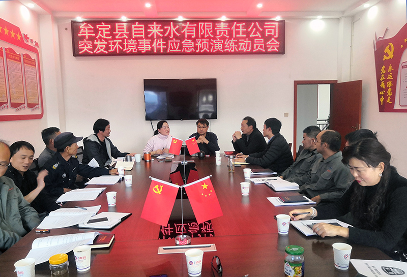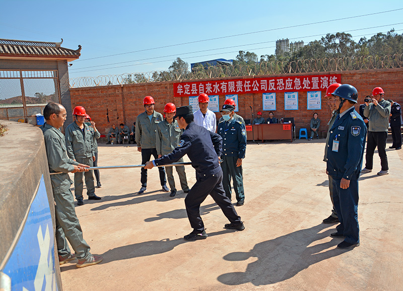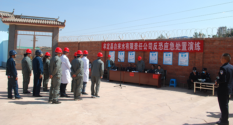 2021年,是实施“十四五”规划、开启全面建设社会主义现代化国家新征程的第一年,也是中国共产党成立100周年。为检验供水突发事件应急预案的科学性、有效性和可操作性,增强全体职工的安全意识、反恐意识、环保意识和责任意识,提高供水应急救援队伍应对突发事件的处置能力,确保党和国家重要会议、重大庆祝活动期间的供水安全,2021年3月12日,牟定县自来水公司在庆丰水处理厂举行了“反恐怖应急处置”和“突发环境事件应急”演练。县住建局、县公安局领导到场指导,县金盾保安公司、自来水公司党员和职工50余人到现场观摩。