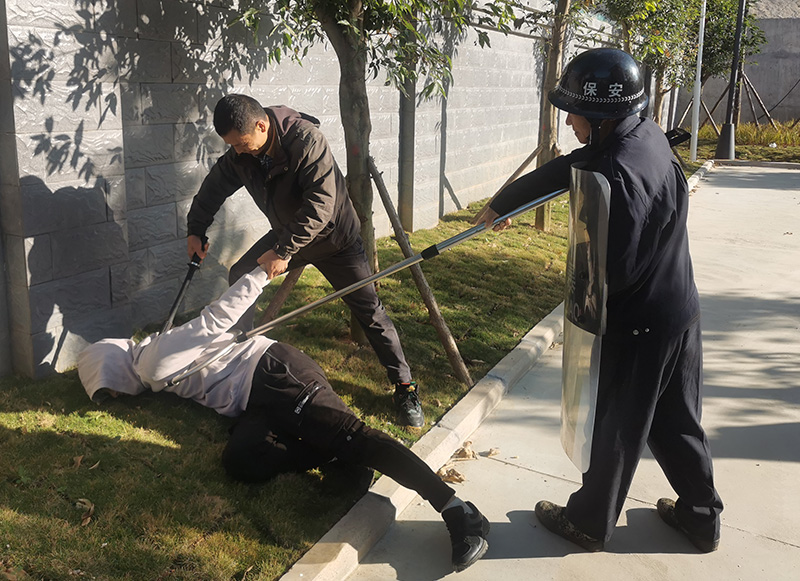演练模拟恐怖分子企图穿越公司侧门,对水厂供水设施进行破坏或者实施投毒,门岗值班保安立即采取制止措施并报告相关负责人。公司安保人员手持盾牌、钢叉、橡胶棒、身穿防刺服迅速赶到侧门口,对“恐怖分子”围堵制止。“恐怖分子”反抗激烈,最终在公司安保人员和值班人员的共同努力下被制服。