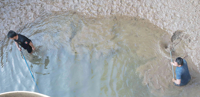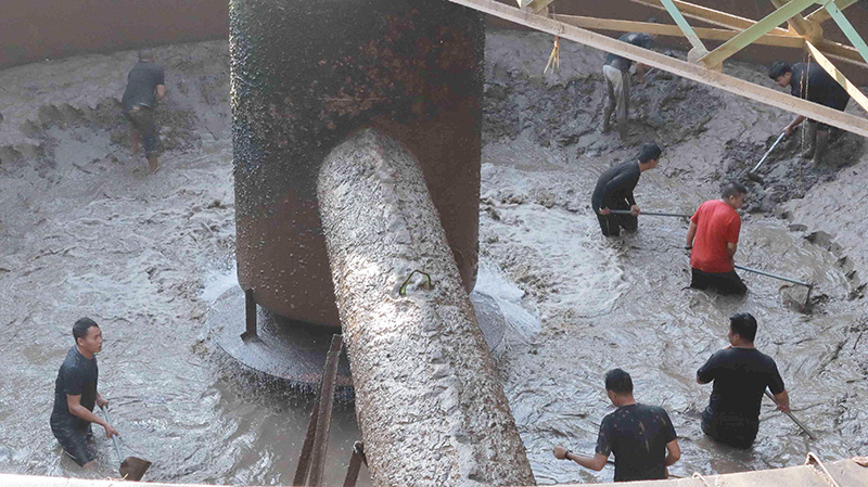 芒市供排水公司承担着芒市建成区以及周边的供水任务,每逢雨季天,大量泥、沙、碎石、杂物冲入原水平流沉淀池和竖流沉淀池。由于地域特殊,只能采取人工进行清除。公司为确保水流、水质、水压正常,每年入冬前都会对平流沉淀池和竖流沉淀池和输水管沿线进行全面彻底的清洗以及维护。