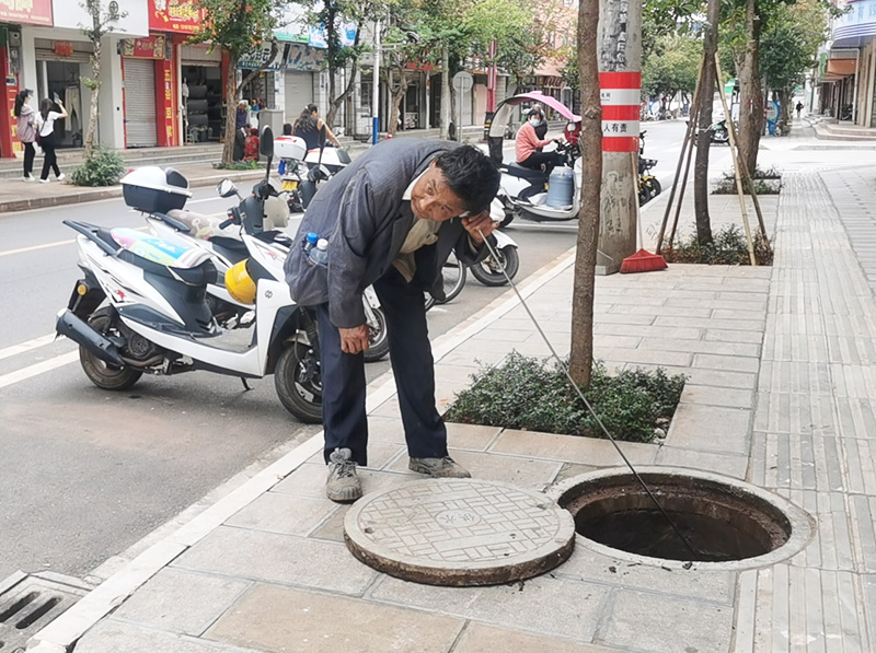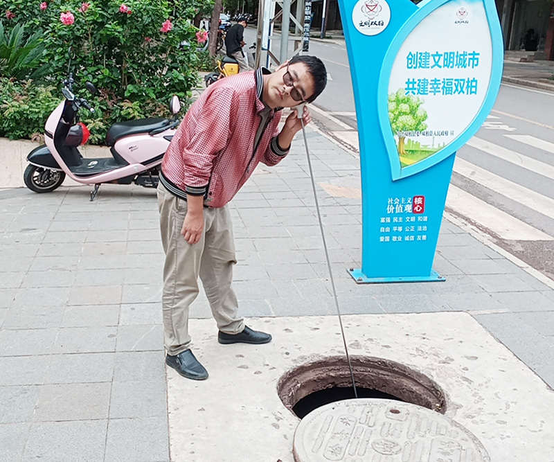 一支井盖钩、一根听音杆,管线组的探漏员徒步穿梭在城市的大街小巷,通过测漏仪,诊断供水管网是否运行“健康”,一旦发现细小漏点便立即调集力量及时抢修,最大限度减少水资源浪费。每走到一处管道上方,他们便停下来拿出“听诊器”——听音杆,细心听诊。这是一根一米多长的金属杆,一端用来抵着地表或阀门,一端连接着一个用于收音的圆柱形仪器。只见他弯腰曲背,侧耳仔细倾听从地表下传送来的声音。管道的振动声、漏水的溢出声、沙石间的碰撞声、漏水搅动周边沙石的噪声等,透过听音杆与测漏仪等专业仪器传递到耳中,再结合管材特质和周边环境、介质等特点,精准分析声音的层次性、多样性,从而判断是否漏水以及精准定位漏水点。