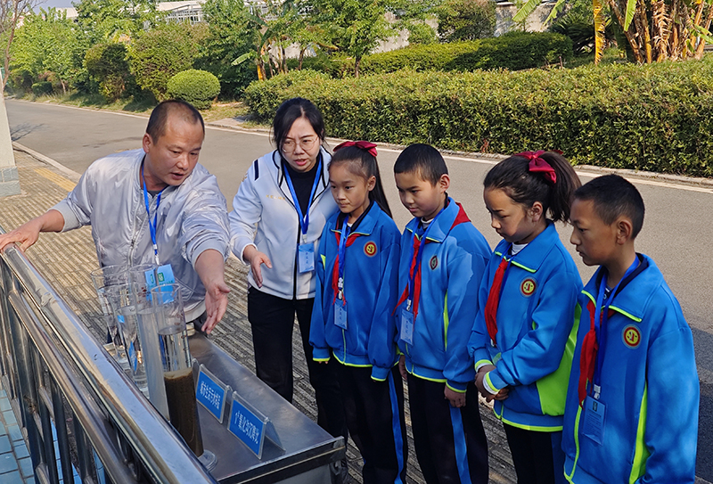 在工作人员的引领下,他们沿工艺处理流程,先后参观了进水口、生物处理池、二沉池、深度处理净化设施、出水口,见证了污水经过一系列处理后逐渐变得清澈透明的神奇变化。工作人员详细地向孩子们解释了污水处理的原理和方法,让孩子们对污水处理有了更加深入的了解。