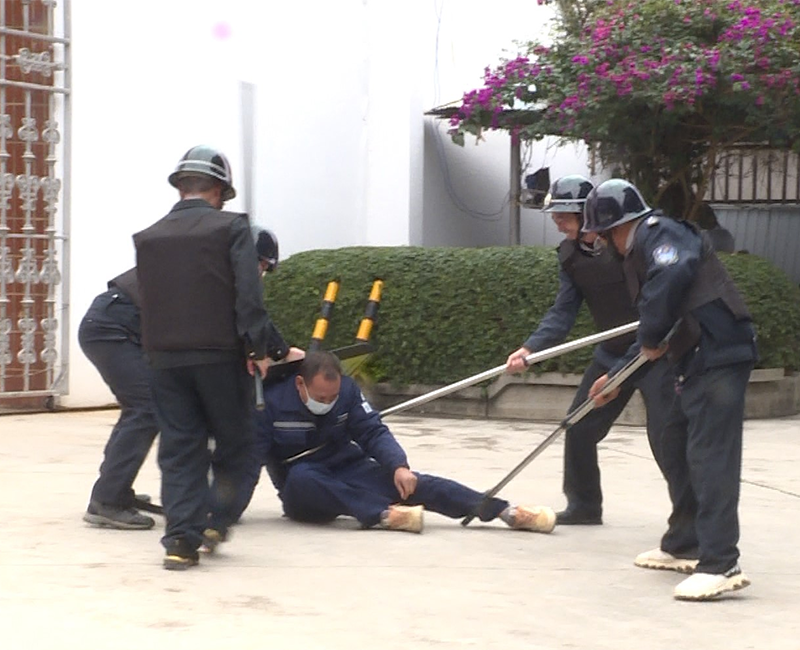 反恐防暴应急处置演练。针对水厂作为关键民生基础设施的反恐需求,演练设置高仿真暴恐突袭场景。演练前,虎城护卫安保公司专业人员讲解了反恐防暴知识及器械使用方法。演练模拟两名“不法分子”携带凶器及“剧毒药品”强行闯入厂区,扬言向水池投毒。在安保人员、增援力量与水厂职工的协同配合下,“暴徒”被迅速制服,供水安全隐患得以消除。