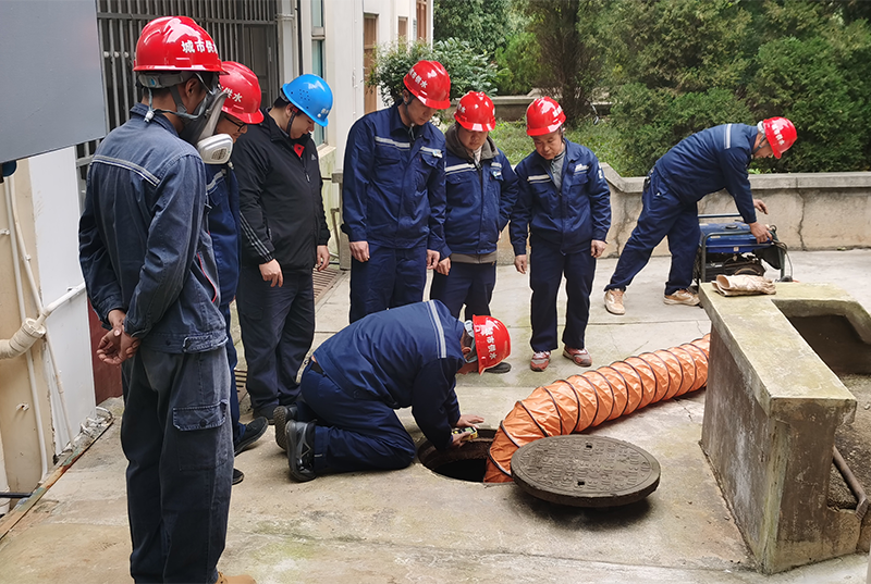 有限空间作业演练。演练以窨井为场景,严格执行“先检测、再通风、后作业”原则。作业前使用气体检测仪对井内氧含量及有毒气体进行检测,达标后开启通风设备。作业人员佩戴防毒面具、安全帽等防护装备,携带防爆照明设备进入井内,规范开展管道检修与杂物清理作业,监护人员全程值守。