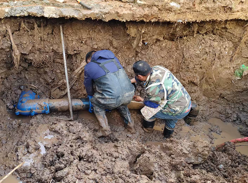 新年收假次日,禹科水务分公司接到木城社区供水故障报修电话,外业维修人员即刻响应、赶赴现场,迅速设置警示标识并勘测定位地下2米处漏水点。为最大限度降低对居民用水的影响,维修人员快速敲定“机械+人力”开挖方案,同步通过社区物业群告知用户短暂停水事宜。