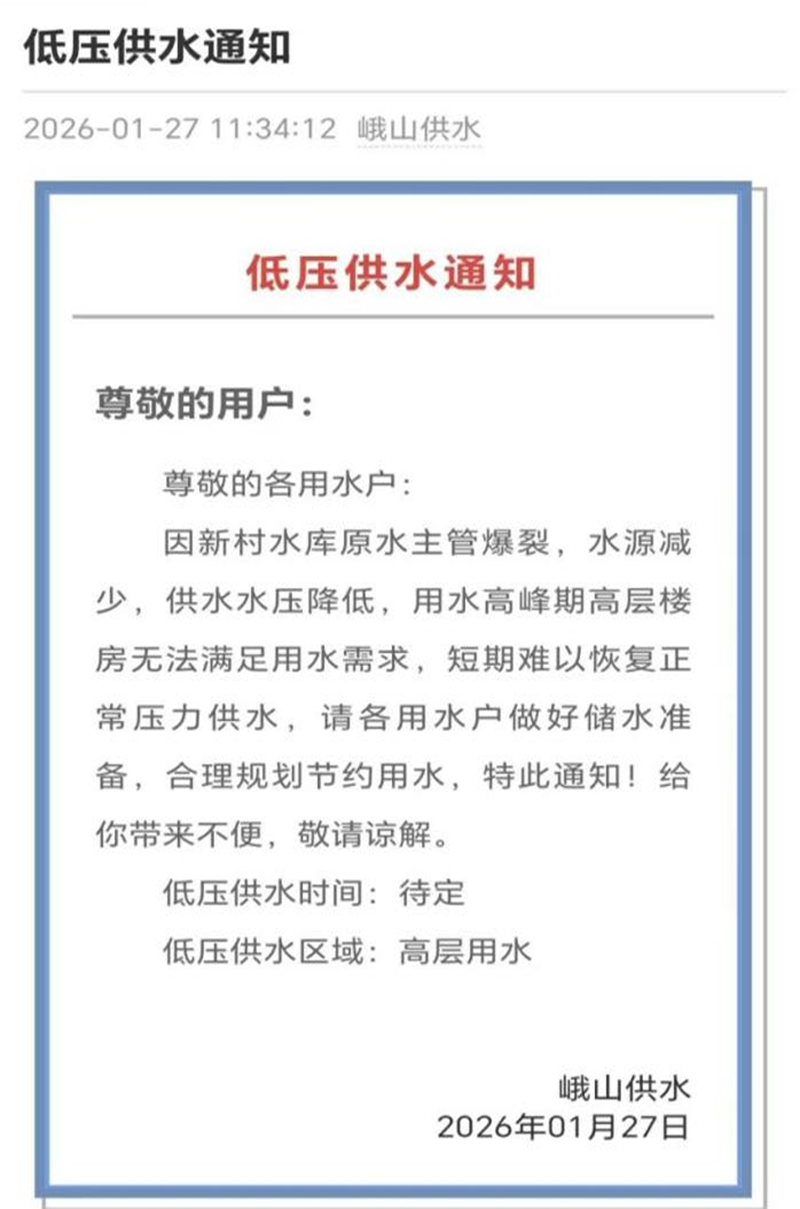 县自来水公司闻令即动、高效响应,采取双线并行的举措,全速推进供水保障工作。一方面,通过“峨山供水”微信公众号发布低压供水提示,清晰阐述情况成因以及水压影响范围,同时推送实用的储水、节水建议,积极回应群众关切,及时安抚公众情绪。另一方面,迅速组建两支抢险突击队伍,分赴一线开展应急补水作业,全力解决原水短缺难题。