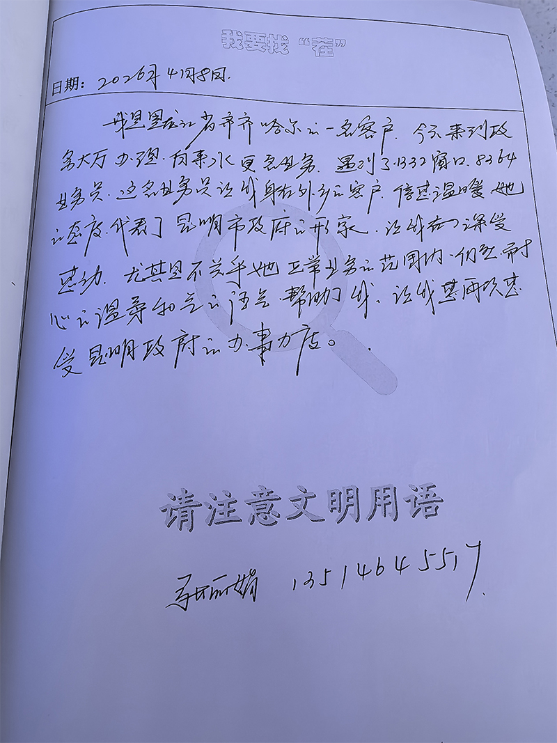 2026年4月8日,黑龙江省齐齐哈尔市的办事用户张丽娟女士来到呈贡区政务服务大厅昆明清源自来水有限责任公司业务窗口办理居民用水户名变更业务,在结束业务办理后,留下了一封表扬信。