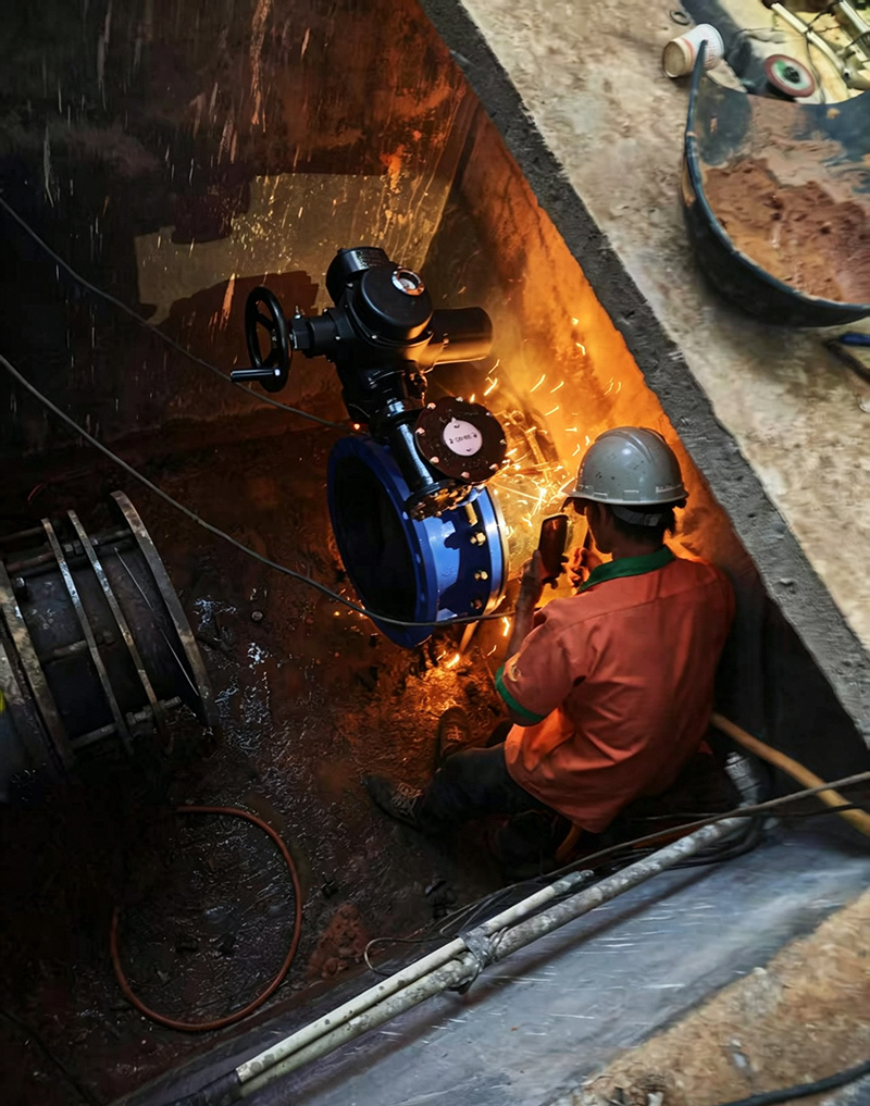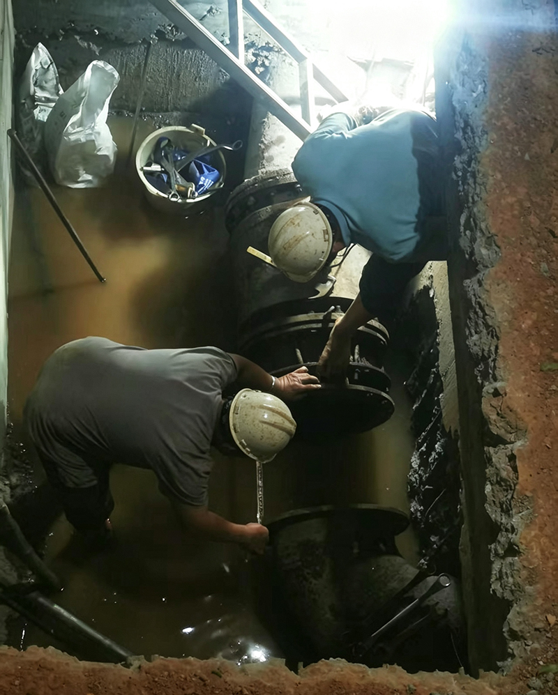 公司提前一天通过公众号发布了停水施工通知。当晚22点整,施工准时启动,工程业务部多名作业人员首先按照预定流程关闭控制阀门,对作业管段进行逐步排空泄压,随后使用挖掘机小心清理闸阀周边覆土。因为作业点位于管道井内,施工空间狭窄,挖机无法完全展开作业,工人只能进入井内,一点点清理余土,再借助挖机将锈蚀严重的旧闸阀缓慢吊出,随后精准对位将新的电动闸阀安装到位。施工过程中,技术负责人全程在现场盯守,每完成一道工序都立即进行密封性和压力测试,确认合格后再推进下一道工序。